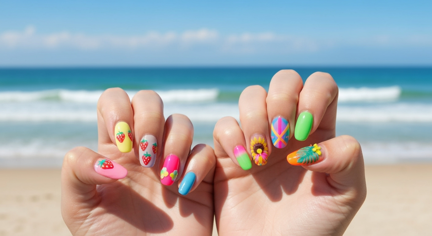 Wzory inspirowane przyrodą, takie jak owoce i kwiaty, cieszą się niezmienną popularnością podczas letnich miesięcy[5]. Na przykład soczyste owoce, jak truskawki, arbuzy czy cytryny, świetnie komponują się z letnimi stylizacjami, dodając paznokciom energii i radości. Z kolei motywy kwiatowe, takie jak róże, słoneczniki i magnolie, dodają subtelności i elegancji, doskonale współgrając z letnim klimatem. Można je zestawiać zarówno z pastelowymi, jak i intensywnymi kolorami, tworząc niepowtarzalne kompozycje.